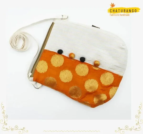 Combination of Lurex Cotton with Gorgeous Brocade Fabric, this minimalist Sling Bag is the perfect accessory for any Party. Tha Handmade Fabric Potli Decoration makes the Bag Unique. A Must Have for Your Upcoming Wedding or any Other Celebrations.